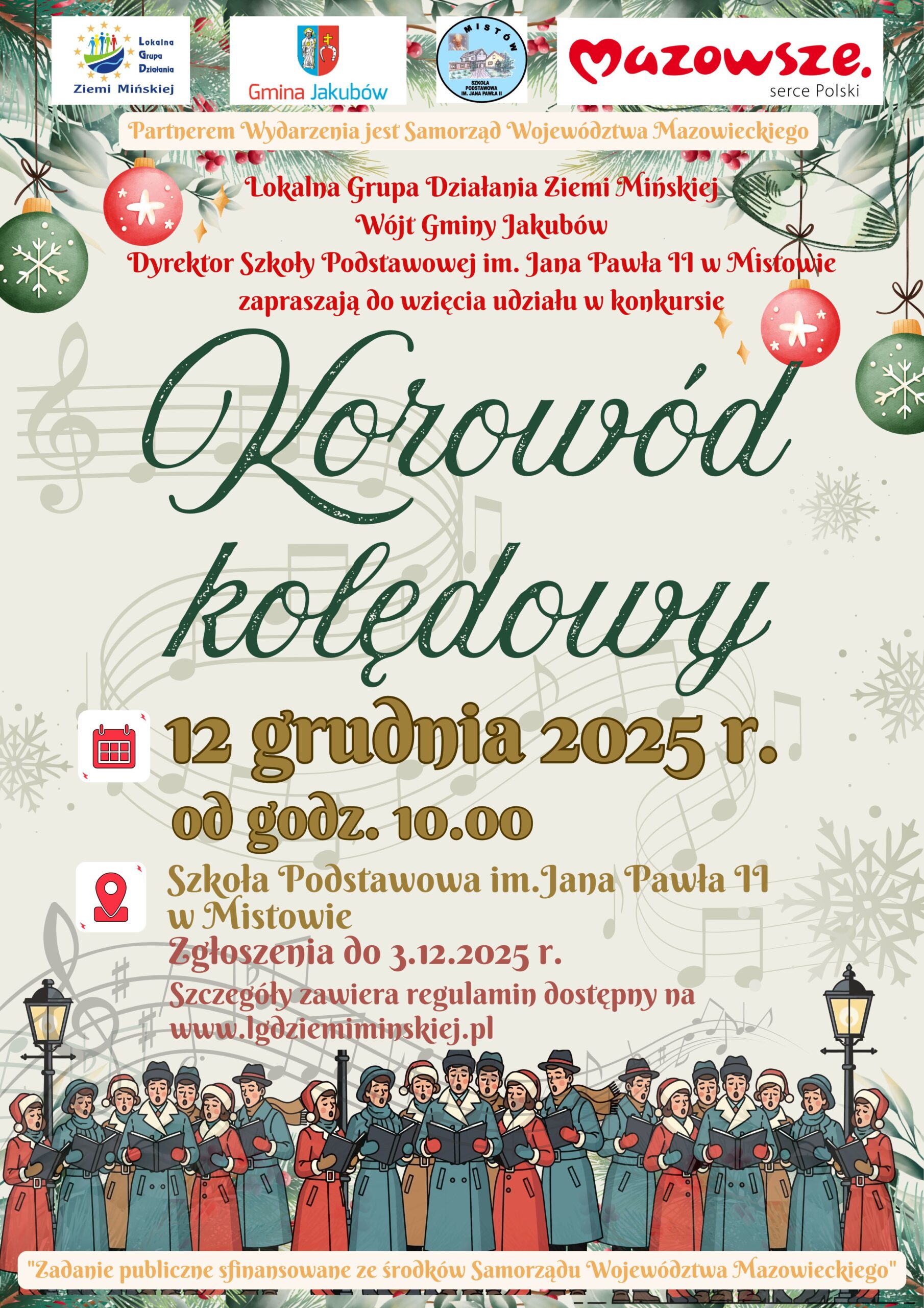 Lokalna Grupa Działania Ziemi Mińskiej zaprasza do wzięcia udziału w konkursie „Korowód kolędowy”. ,,Korowód kolędowy” to uroczystość, konkurs organizowany rokrocznie przez Lokalną Grupę Działania Ziemi Mińskiej w partnerstwie z miastami, gminami, szkołami, ośrodkami kultury z terenu LGD. Jest to już 14 edycja tego wydarzenia. W tym roku Partnerem wydarzenia jest Samorząd Województwa Mazowieckiego we współpracy z Gminą Jakubów oraz Szkołą Podstawową w Mistowie. Konkurs odbędzie się w Szkole w Mistowie adres: ul. Szkolna 3, 05-306 Jakubów w dniu 12 grudnia (piątek) 2025 r. od godz. 1000.